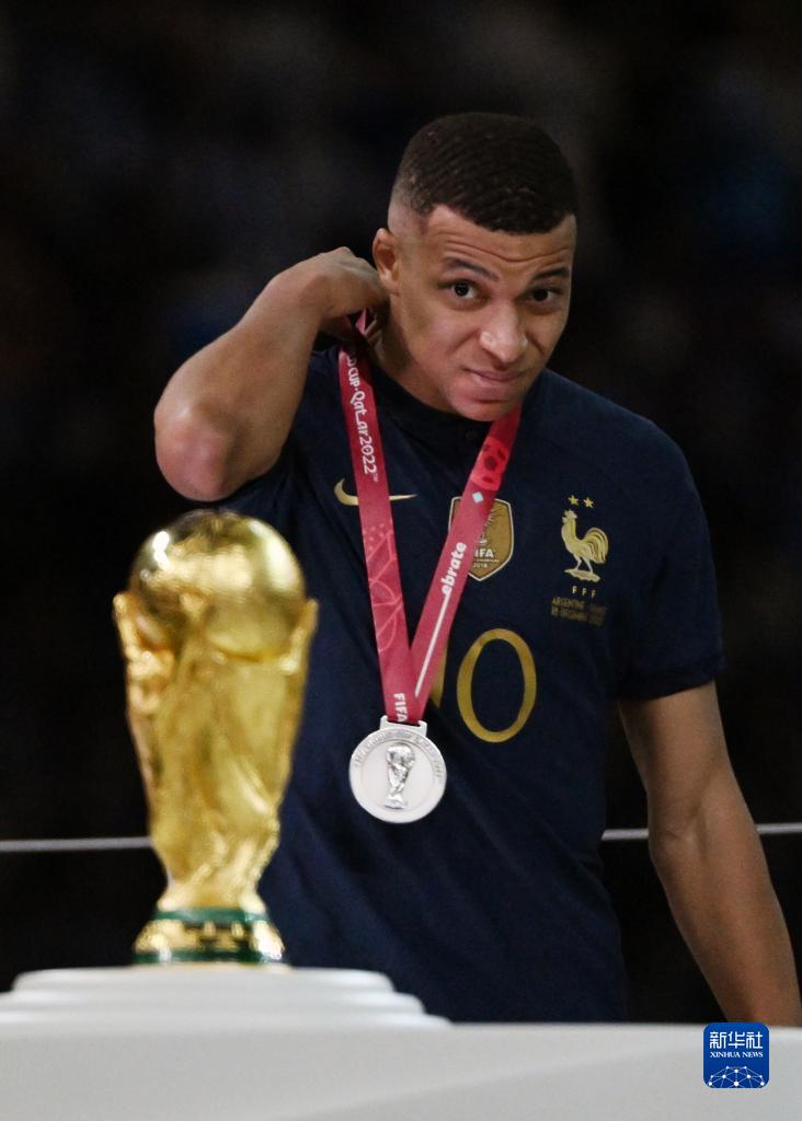 2022年12月18日,获得世界杯金靴奖的法国队球员姆巴佩在颁奖仪式上注视大力神杯。