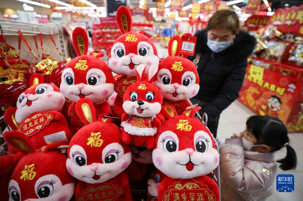 1月10日,江苏淮安市民在超市挑选生肖兔玩具。