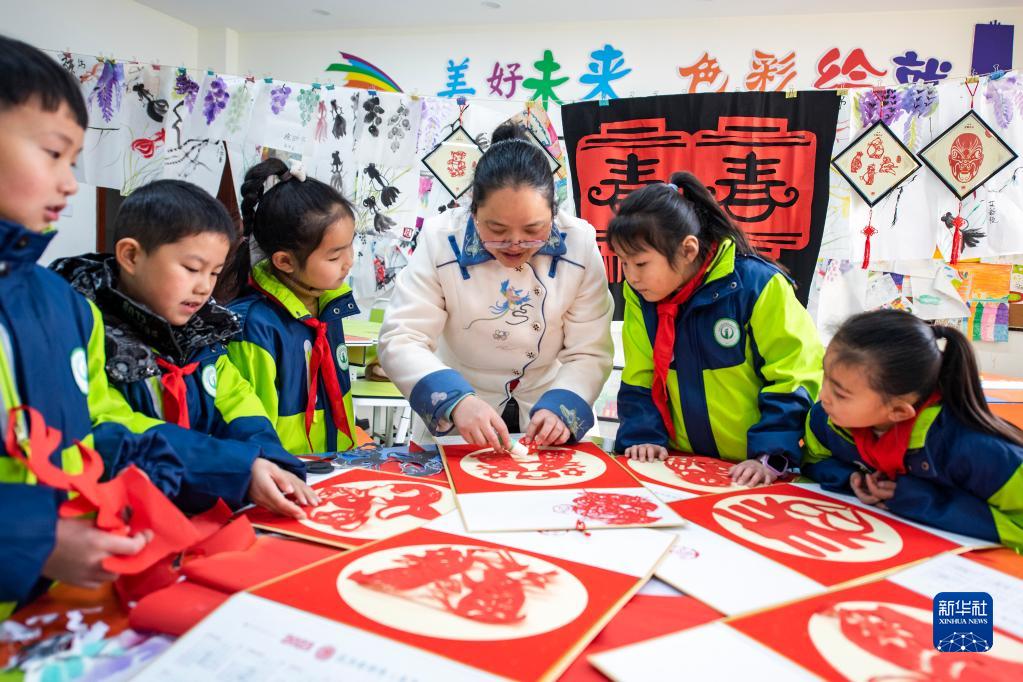 1月10日,安徽省芜湖市繁昌区繁阳镇城关一小师生在创作剪纸作品。