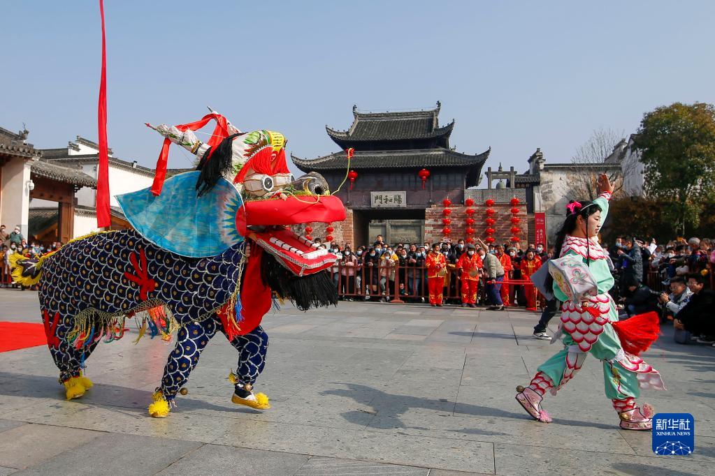1月10日在安徽省黄山市歙县徽州古城拍摄的民俗表演富堨麒麟舞。
