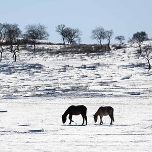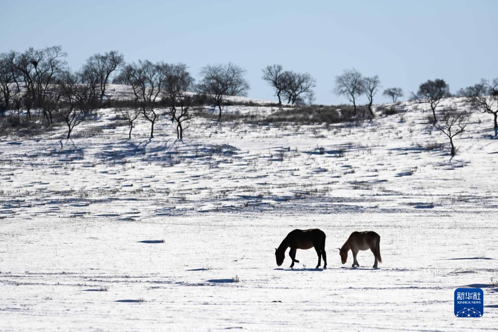 马匹在西乌珠穆沁旗的雪原上觅食(1月9日摄)。