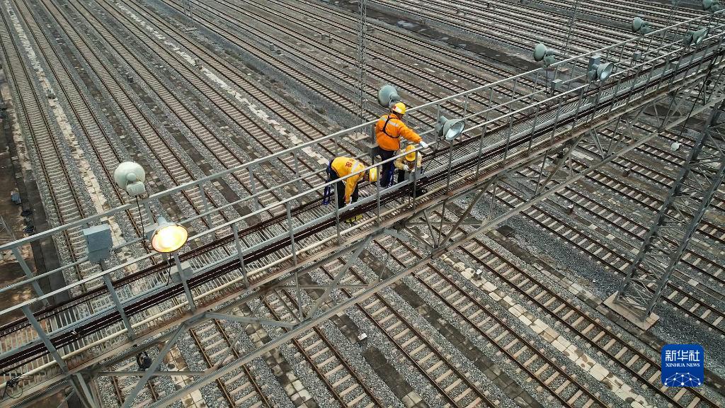 春运期间,中国铁路南宁局集团有限公司南宁动车所的接触网工们要定期登上24米高、120米长的灯桥,对列车运行径路的灯塔、灯桥、电力钢柱开展专项排查检修,确保亮灯率在80%以上,保障运行高峰期列车平安出行。
