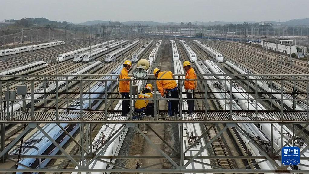 春运期间,中国铁路南宁局集团有限公司南宁动车所的接触网工们要定期登上24米高、120米长的灯桥,对列车运行径路的灯塔、灯桥、电力钢柱开展专项排查检修,确保亮灯率在80%以上,保障运行高峰期列车平安出行。