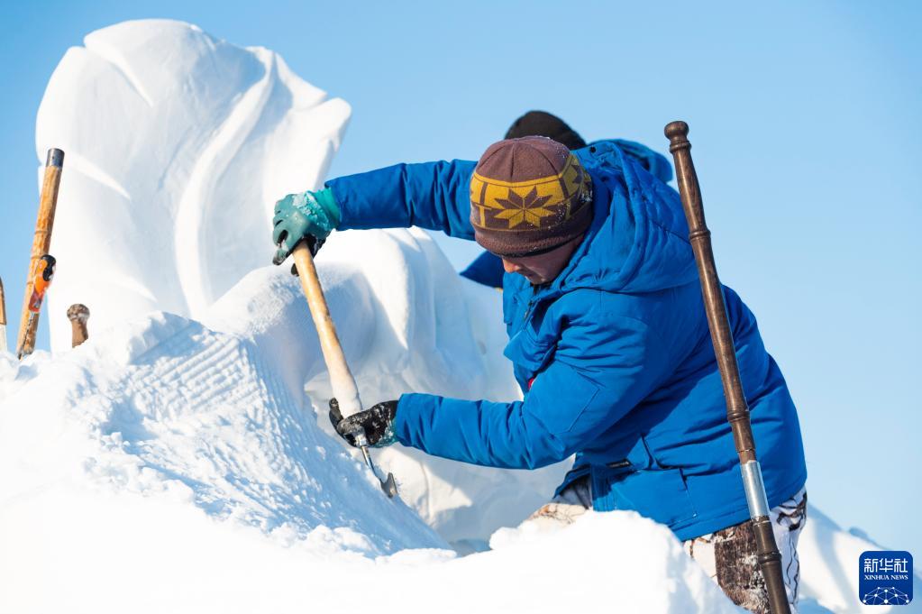 1月10日,在哈尔滨太阳岛雪博会园区,参赛选手进行雪雕创作。