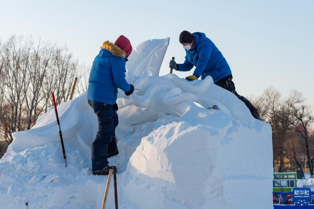 1月10日,在哈尔滨太阳岛雪博会园区,参赛选手进行雪雕创作。