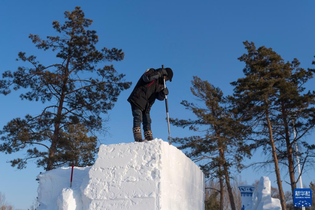 1月10日,在哈尔滨太阳岛雪博会园区,参赛选手进行雪雕创作。