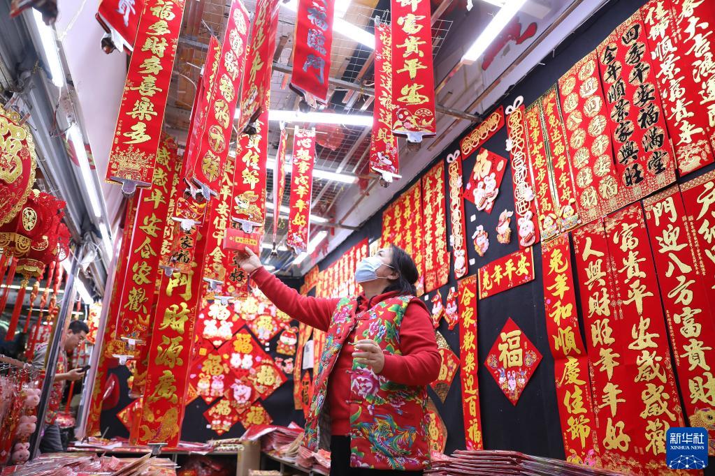 1月11日,辽宁沈阳五爱国际小商品城的一位店主在整理对联。