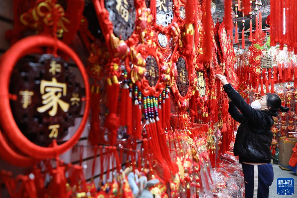 1月11日,辽宁沈阳五爱国际小商品城的一位店主在整理货品。