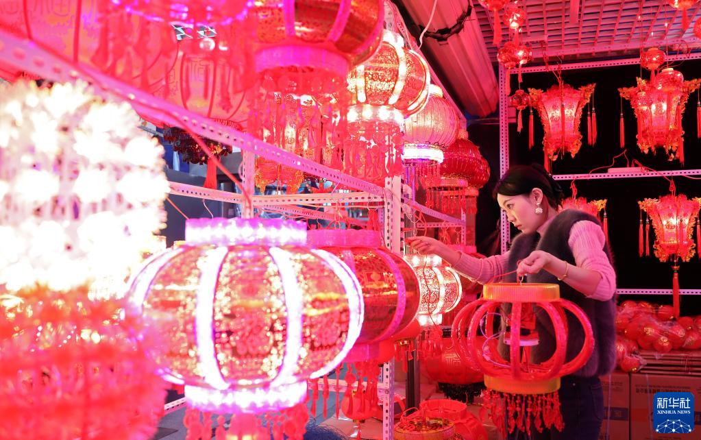 1月11日,辽宁沈阳五爱国际小商品城的一位店主在整理测试灯笼。
