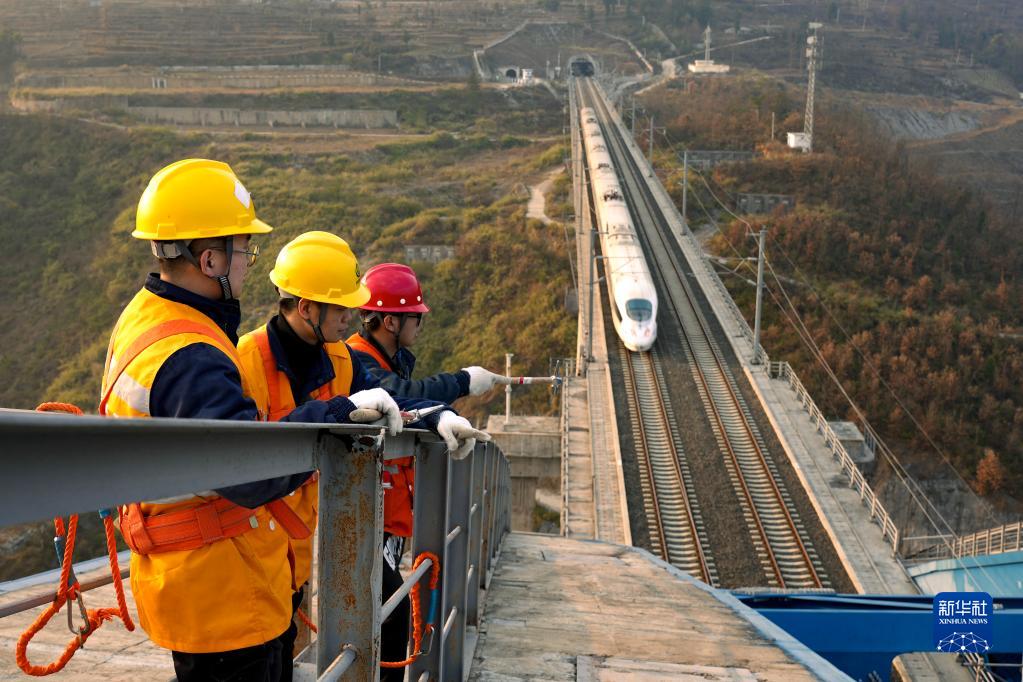 成贵高铁鸭池河特大桥横跨贵州省黔西市境内的鸭池河,在地势险峻的峡谷间,每天约有100多组春运动车穿行经过。在最高处距离河面约277米的大桥上,铁路职工坚守岗位,严格巡检,对大桥的钢结构、供电设备、桥梁支座、外包混凝土等进行细致检查,根据列车运行情况调整轨道线路的几何尺寸、进行钢轨探伤等作业,全力保障春运期间动车组安全通过。
