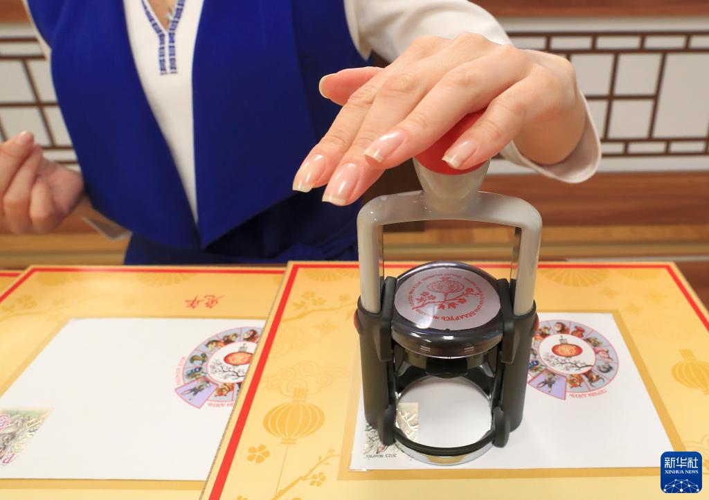 1月10日,在白俄罗斯明斯克,工作人员在白俄罗斯通信与信息化部发行的中国兔年首日封上盖戳。