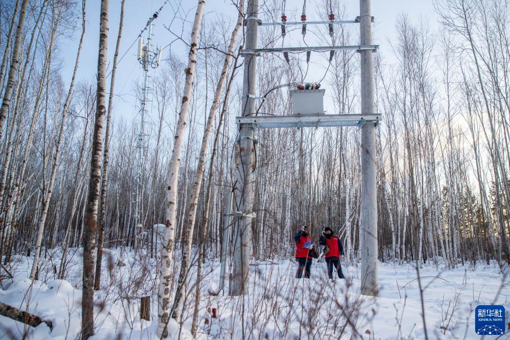 1月9日,线路设备运维人员马国军(左)和代洪滨在查看龙岛线的线路情况。新华社记者 张涛 摄