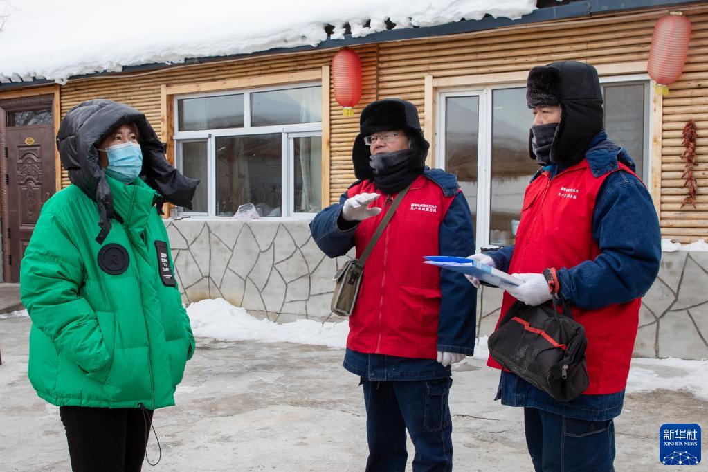1月9日,在漠河市北极村一家民宿内,线路设备运维人员代洪滨(中)叮嘱民宿负责人注意用电安全。新华社记者 张涛 摄