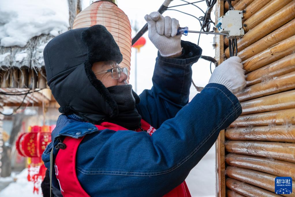 1月9日,在漠河市北极村,线路设备运维人员代洪滨在帮助一家民宿维修设备。新华社记者 张涛 摄