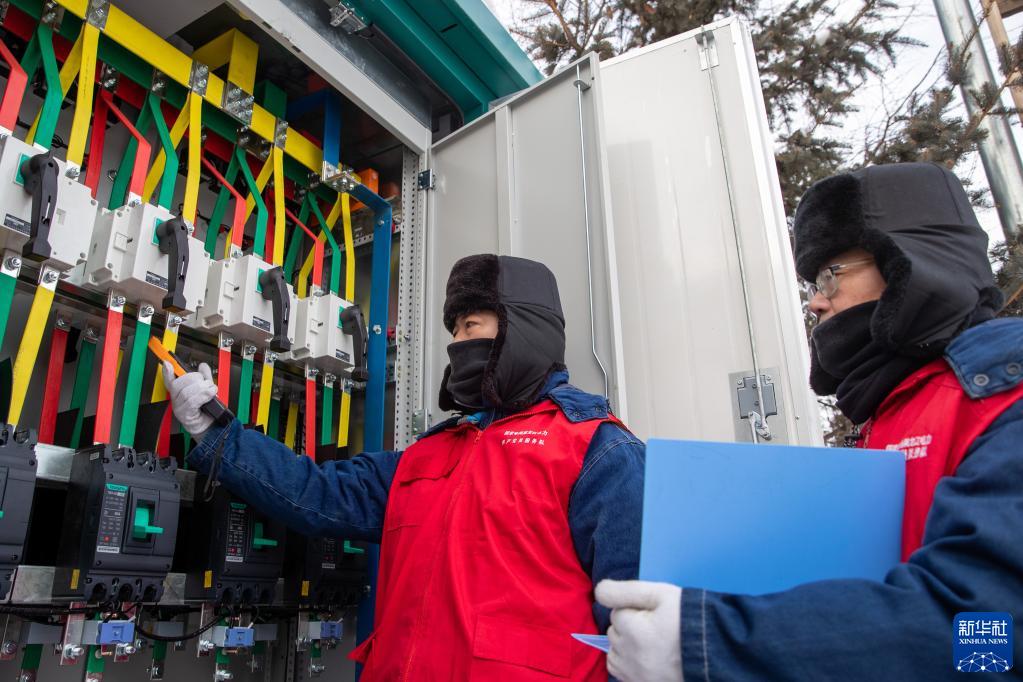 1月9日,在漠河市北极村,线路设备运维人员马国军(左)和同伴代洪滨在检查设备。新华社记者 张涛 摄
