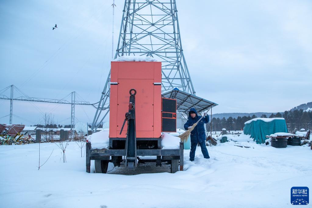 1月11日,线路设备运维人员马国军在北极村供电所内清理积雪。新华社记者 张涛 摄