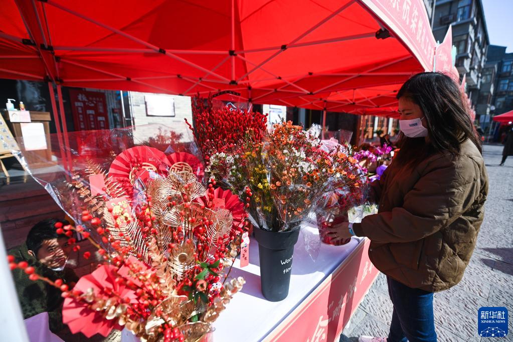 1月11日,人们在杭州市余杭区瓶窑镇瓶窑老街年货节上在采购年宵花。
