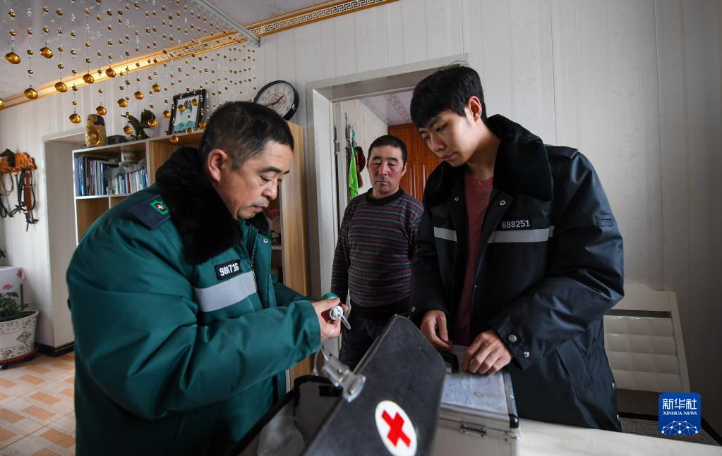 1月7日,姚春明(左)和同事(右)前往牧民家巡诊。