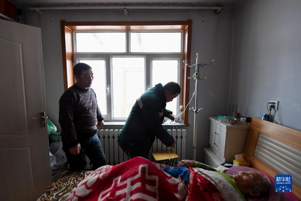 1月7日,姚春明(中)在牧民家为高龄老人治病。