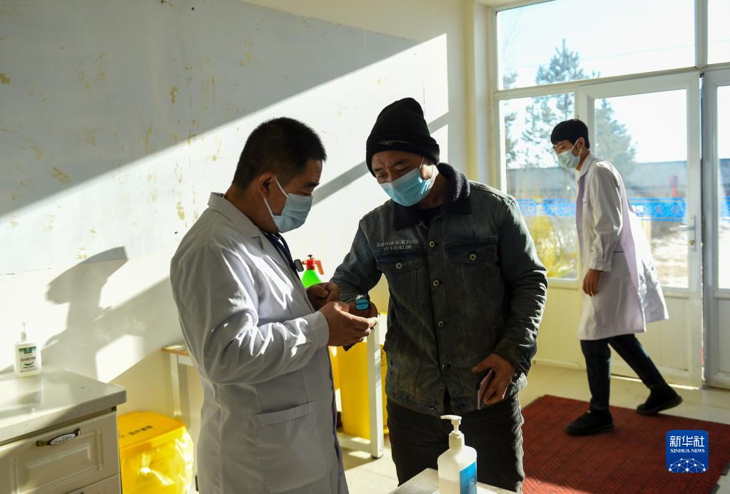 1月7日,姚春明(左)在巴彦高勒卫生院内用血氧仪查看牧民的身体状况。
