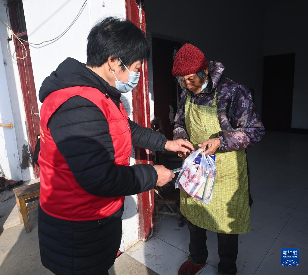 1月11日,嘉兴市南湖区余新镇普光村暖心小分队志愿者马玲弟(左)帮行动不便的77岁低保户濮杏英配好慢性病药物并送货上门。