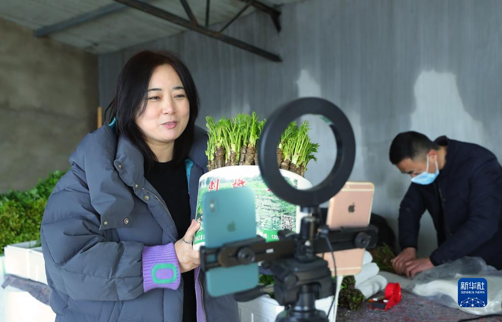 1月9日,在新民市大民屯镇毓宝台村大棚里,农民在大棚里直播销售刺嫩芽盆栽。