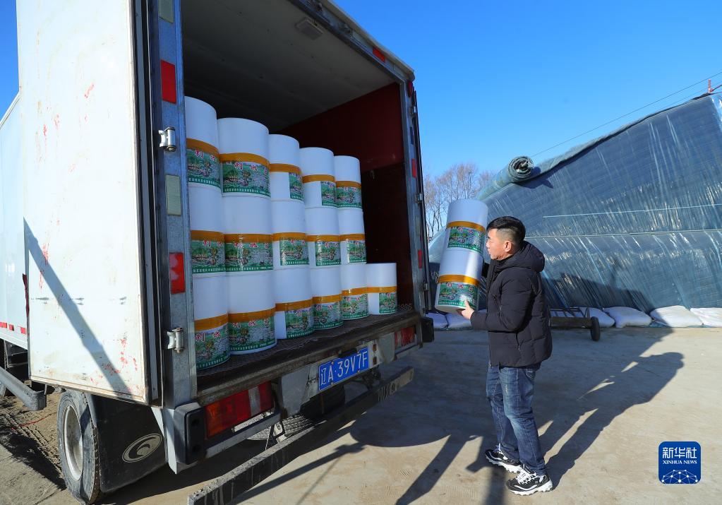 1月9日,在新民市大民屯镇毓宝台村,农民装运包装好的刺嫩芽盆栽。
