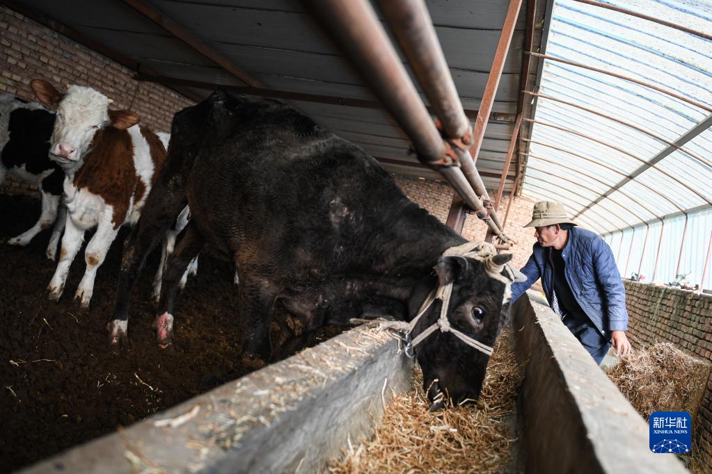 1月9日,孙海云在牛圈内给牛添加饲料。