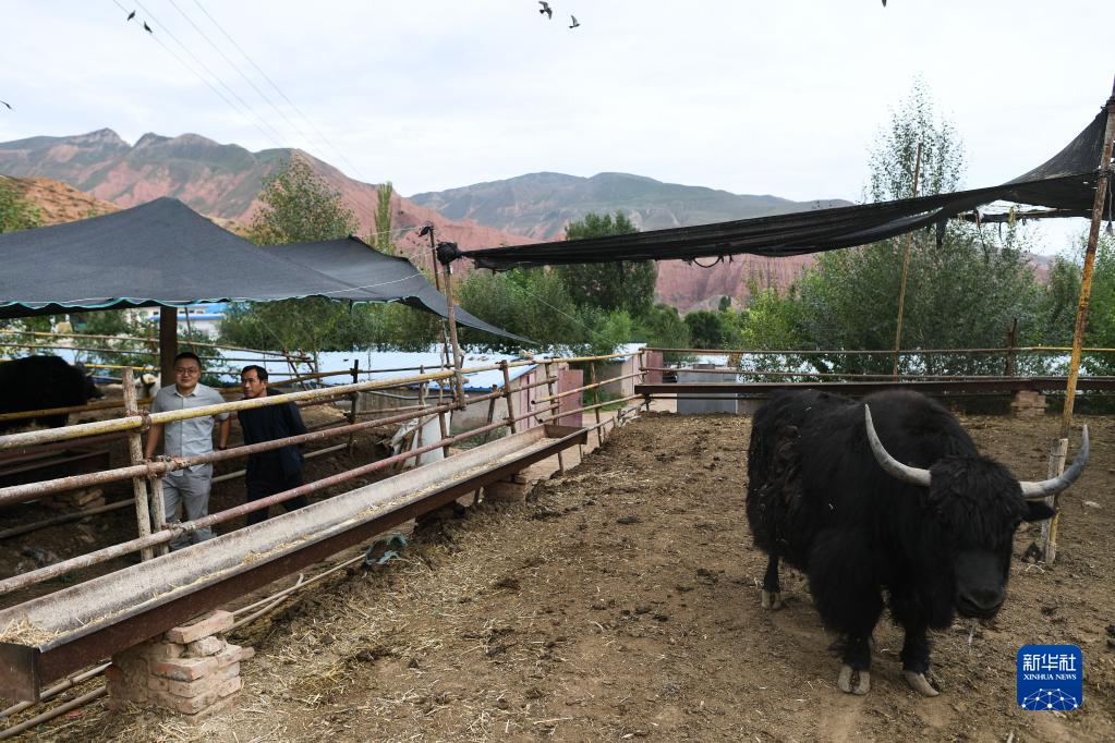孙海云(右)向青海联通技术人员介绍牛圈情况(2021年7月15日摄)。