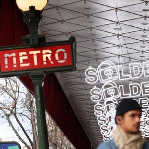 1月11日,一名女子走过法国巴黎街头的打折季广告。
