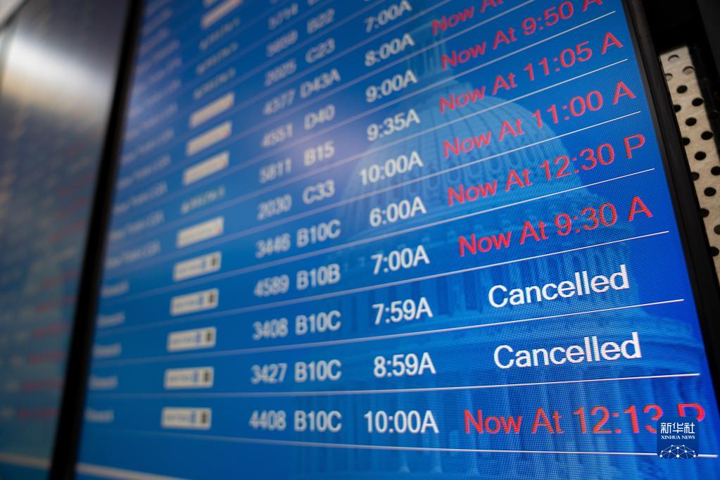 1月11日,在美国弗吉尼亚州阿灵顿的里根国家机场,信息显示众多航班延误或取消。新华社记者 刘杰 摄