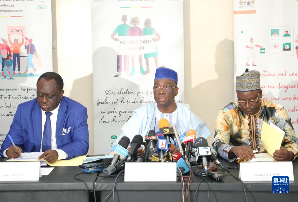 1月11日,贝宁全国选举自治委员会主席萨卡·拉菲亚(中)在科托努公布国民议会选举初步结果。