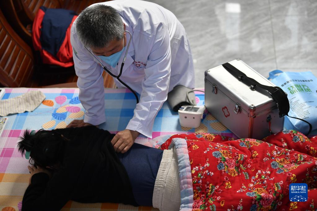 1月11日,河北省唐山市丰南区王打刁村“农村巡诊小分队”村医孙庆良(上)为村民上门诊疗。