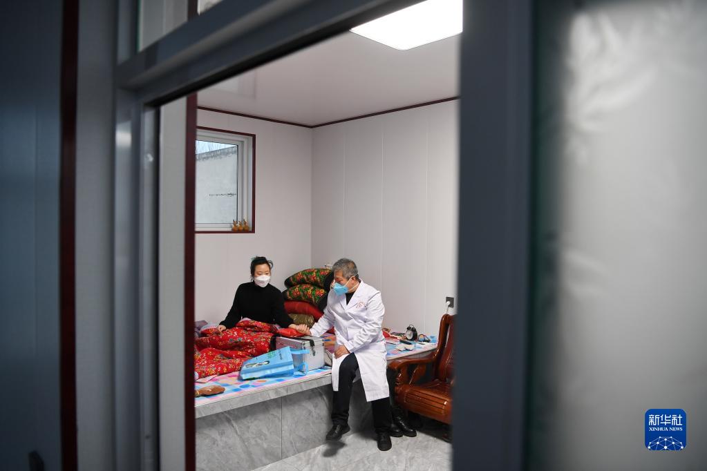 1月11日,河北省唐山市丰南区王打刁村“农村巡诊小分队”村医孙庆良(右)为村民上门诊疗。