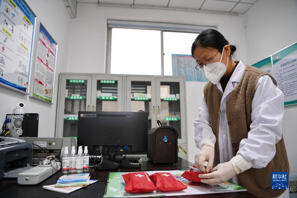 1月11日,河北省唐山市丰南区岭子上村“农村巡诊小分队”村医董秀芹在整理为村民发放的“健康礼包”。