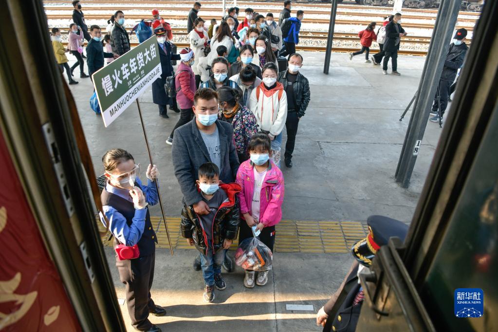 1月10日,旅客在贵州凯里站排队准备登上5640次列车出行。