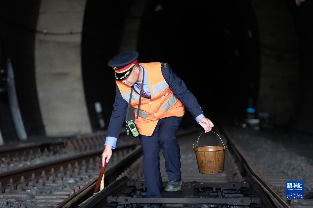 毛忠辉在给道岔刷油养护(1月11日摄)。