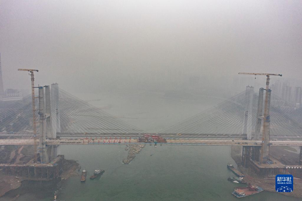 这是李家沱长江复线桥合龙施工作业现场(1月12日摄,无人机照片)。