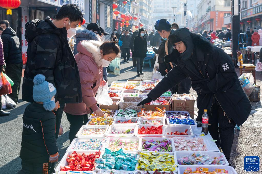 春节临近,黑龙江省绥芬河市龙须沟步行街的年货大集十分热闹。不少市民前来选购年货,迎接新春的到来。