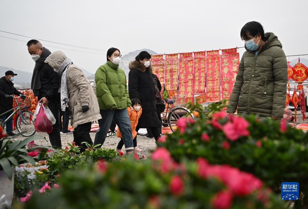 1月12日,前来赶集的居民在西路庄大集上挑选花卉。