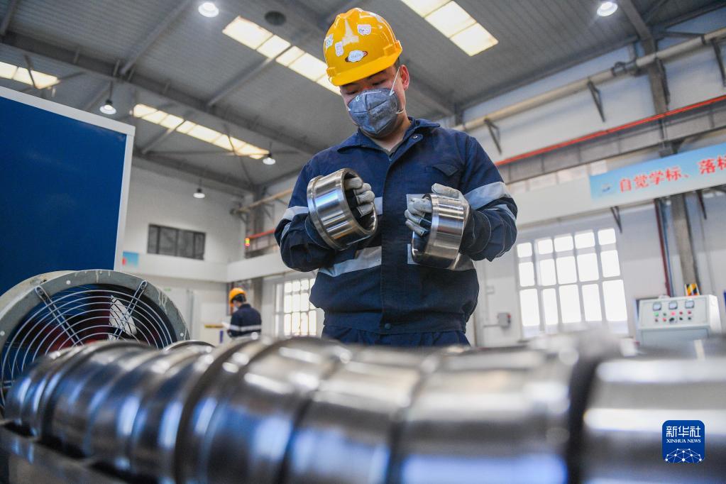 1月12日,工作人员在包头车辆段检修车间轮轴检修间作业。