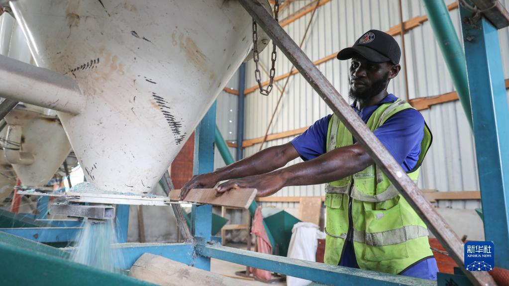 2022年12月29日,在加蓬首都利伯维尔的恩考克经济特区,当地工人在一家中国塑料加工厂工作。