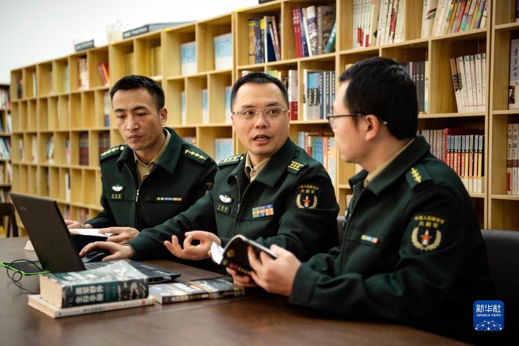 火箭军某部处长丁国林(中)与骨干一起研究对抗训练问题(资料照片)。