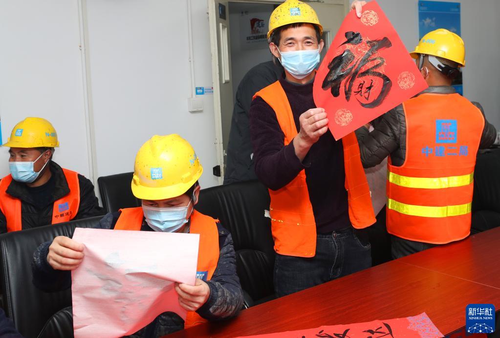 当日,在中建二局华东公司上海谈家桥项目工地,来自谈家桥社区的书法爱好者为工人师傅们现场写春联和福字,送上春节祝福。