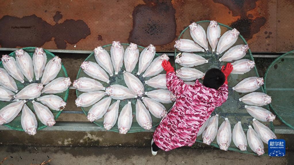 在岳阳市君山区钱粮湖镇六门闸社区生态渔村,居民在晾晒鱼干(1月12日摄 ,无人机照片)。