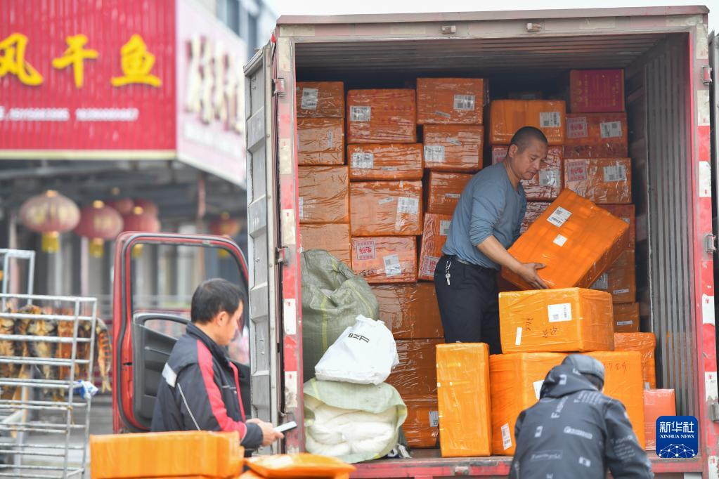 在岳阳市君山区钱粮湖镇六门闸社区生态渔村,物流工作人员将打包好的风干鱼装车(1月12日摄)。