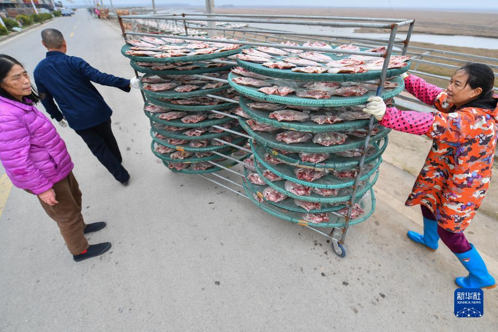 在岳阳市君山区钱粮湖镇六门闸社区生态渔村,居民在运送晾晒好的鱼干(1月12日摄)。