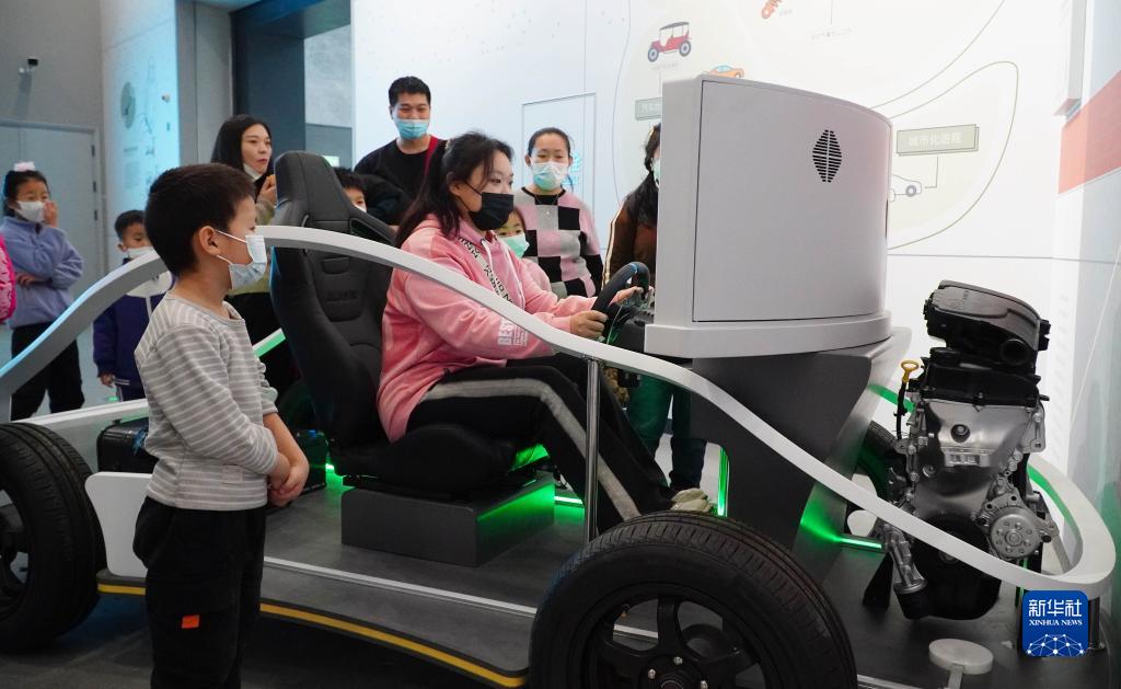 1月13日,在山东省科技馆新馆,参观者在体验模拟汽车驾驶的展品。