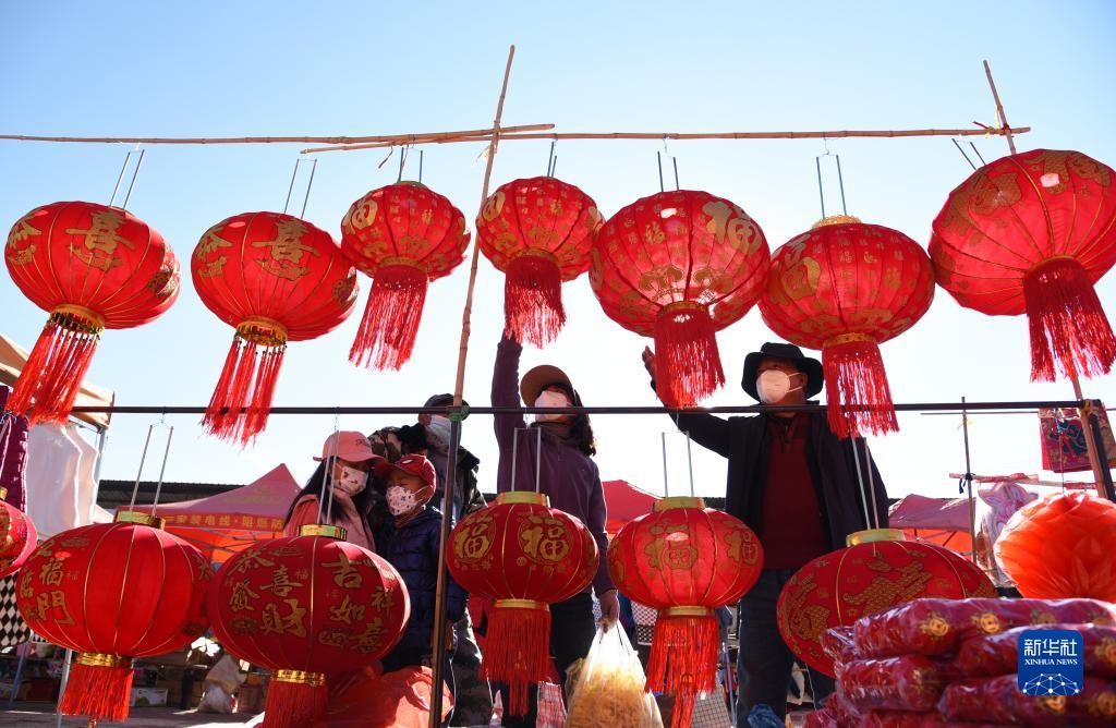 1月13日,在云南省丽江市玉龙纳西族自治县太安乡,村民在集市上采购灯笼。