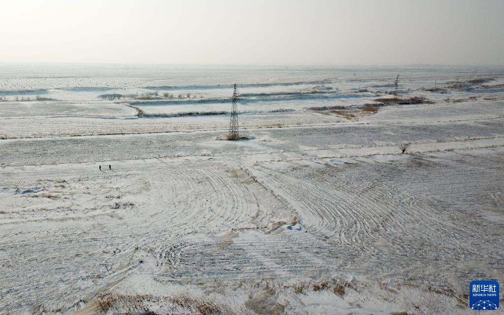 1月12日,国网抚远市供电分公司抓吉供电所所长白桦先和工友费义伟在巡视东极线的路上(无人机照片)。